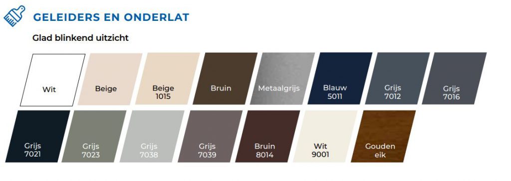 Onze rolluiken zijn verkrijgbaar in heel veel verschillende kleuren aan te raden is om alles dezelfde kleur te nemen. Het is altijd mogelijk om de kast en lamellen in een andere kleur te nemen. Hierdoor ontstaan er altijd mooie kleurencombinaties bijvoorbeeld witte lamellen met een antraciet kleur bak. Hiernaast vindt u de beschikbare kleuren waaruit u kunt kiezen.